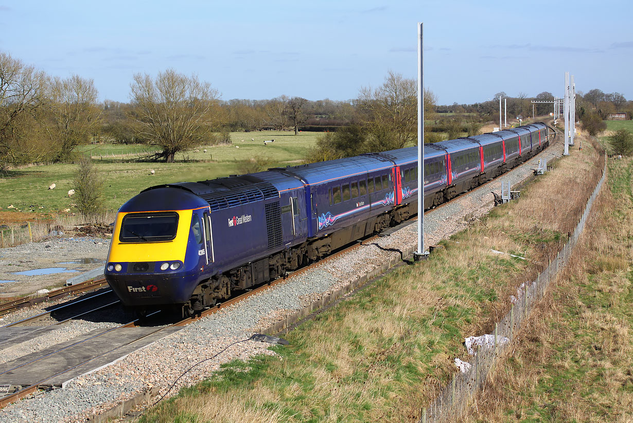 43165 Prince Michael of Kent approaches the site of Ashbury Crossing, Shrivenham, on 13 March 2017 with the 1C15 13:00 Paddington to Bristol Temple Meads. After decades of using this vantage point for photography, the masts mark the end of this particular viewpoint. |