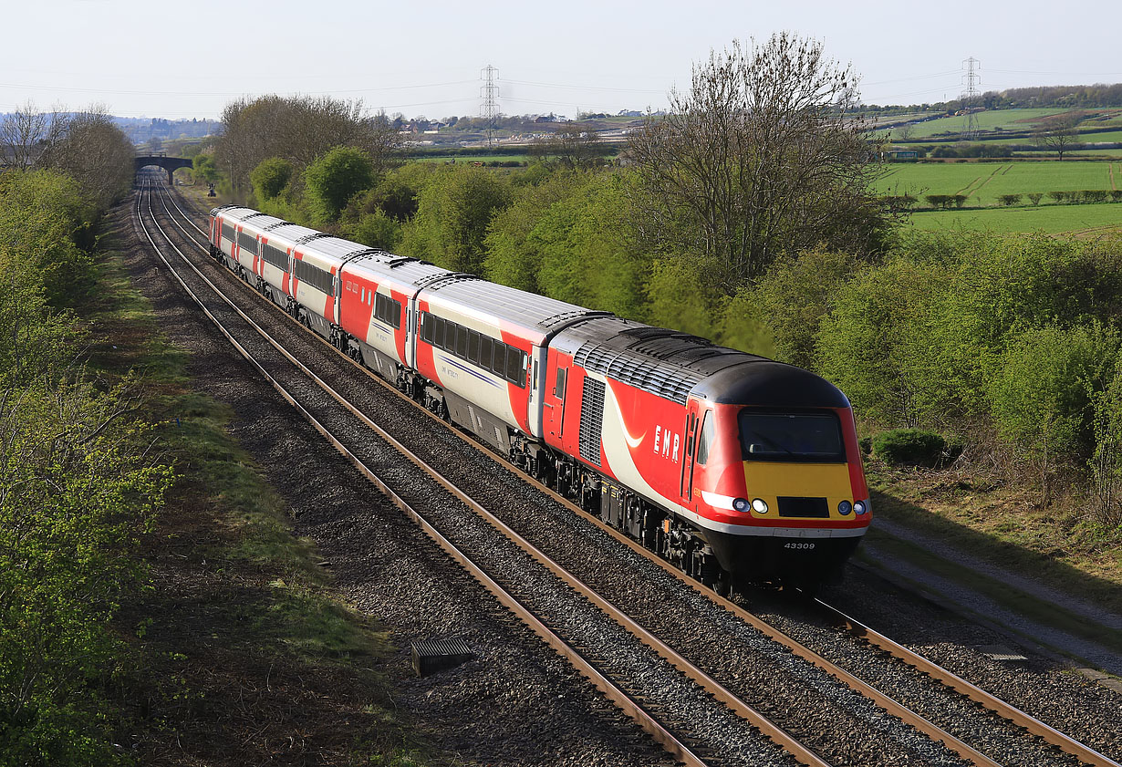 43309 passes Braybrooke on 23 April 2021 with the 1B63 16:45 Nottingham to St Pancras International East Midlands Railway service. Severely backlit, but at least the train is still completely free of shadows from the lineside bushes.