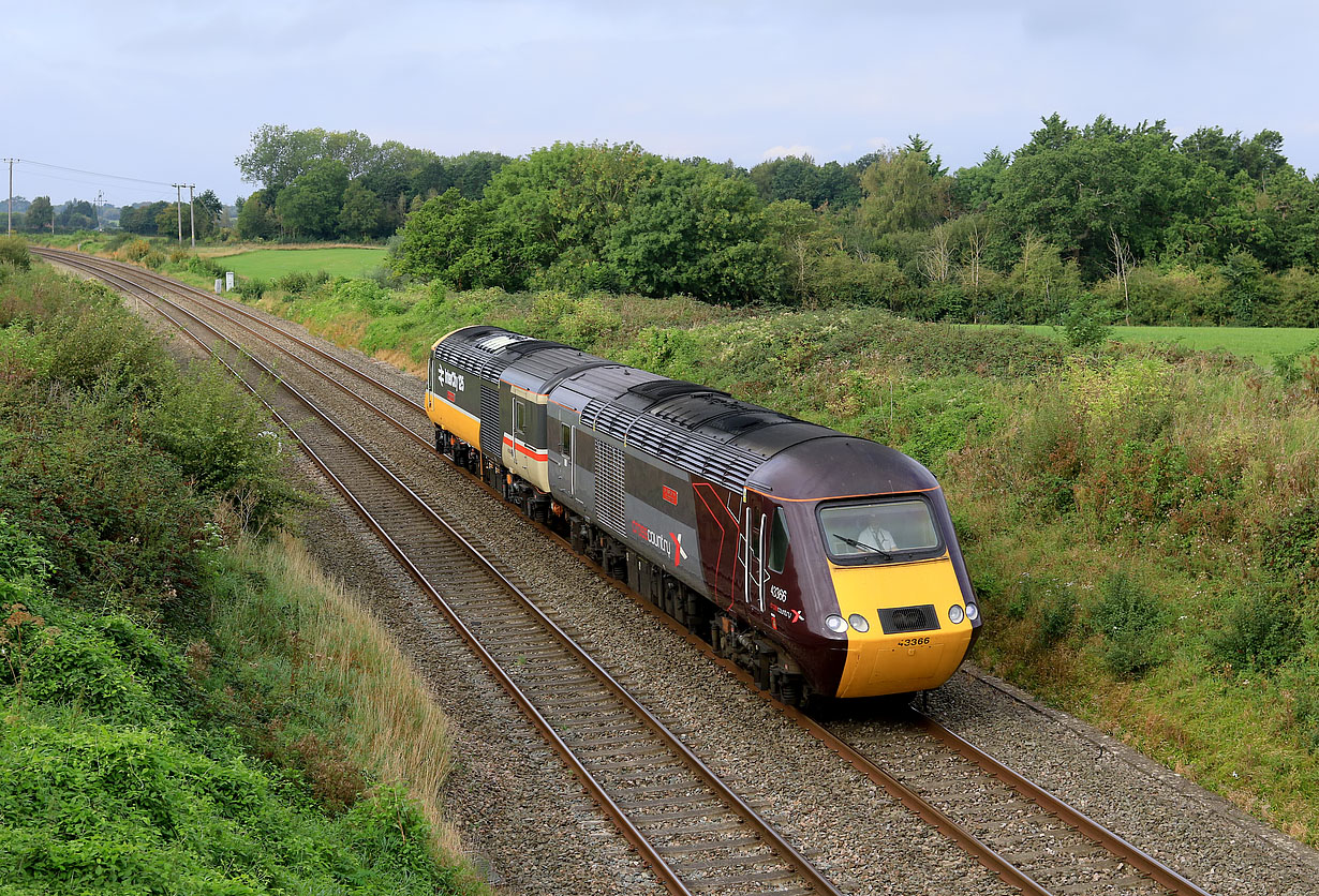 43366 HST 40 Celebrating 40 Years of High Speed Train services on the Cross Country network & 43184 Laira Diesel Depot pass Gossington on 15 September 2023, running as the 5Z43 07:18 Laira to Neville Hill. They were working to Leeds so as to be in a position to substitute for 43007 & 43008 on the CrossCountry farewell railtour, if required. |
