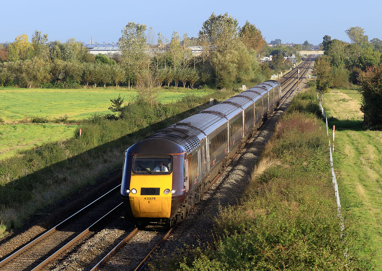 Running 40 minutes late, 43378 passes Claydon on 10 October 2019 with the 1V44 06:11 Leeds to Plymouth CrossCountry service. Lineside vegetation is starting to increase again, but it is still nowhere near as bad as it was as recently as 2013, although some trees in the background have increased in height enormously. |