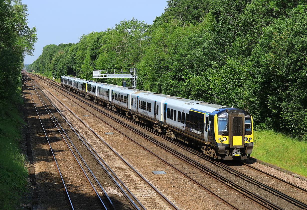 444023 & 444003 run along the up relief line at Old Basing on 16 June 2023 with the 1T26 07:54 Portsmouth Harbour to Waterloo South Western Railway service. Because of the tall trees on the left, this location is only really any use for photography in mid summer, or on a dull day! |