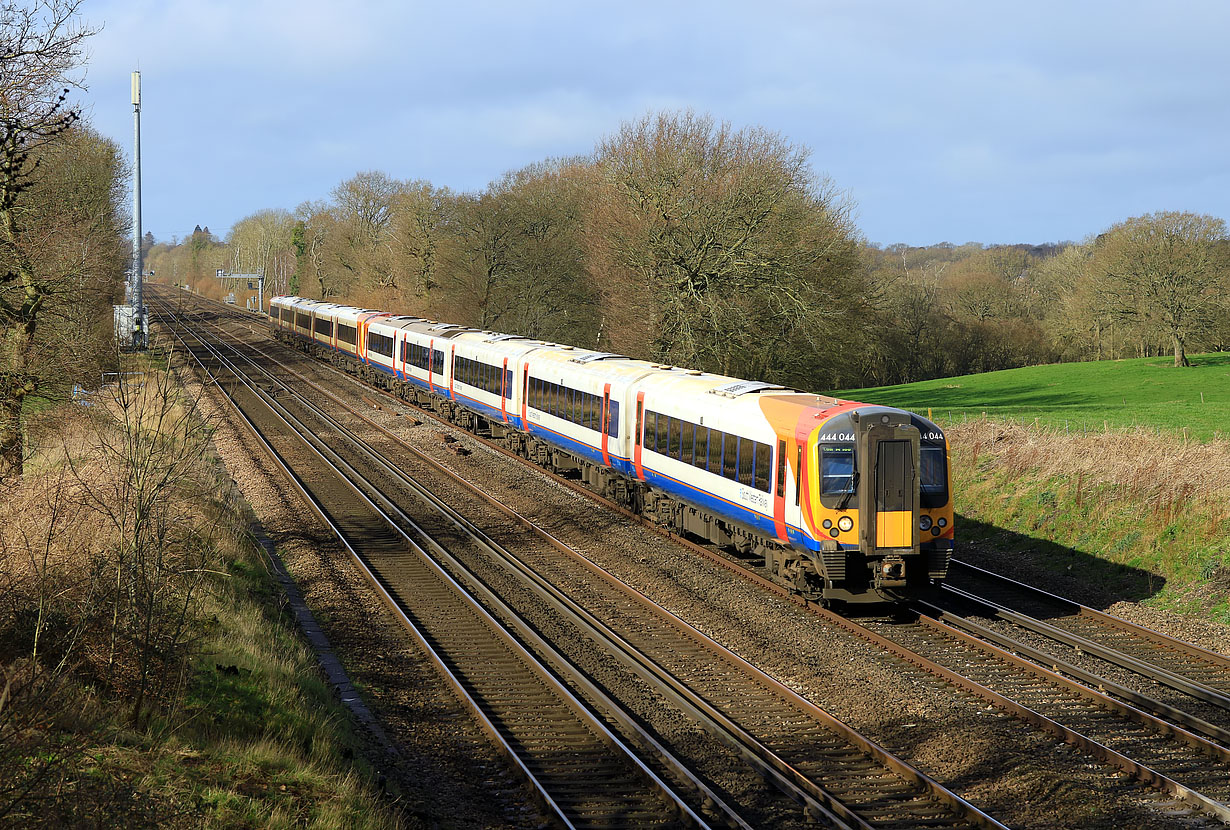 444044 & 444032 pass Potbridge on 8 March 2020 with the 1T28 08:17 Portsmouth Harbour to Waterloo South Western Railway service. Only 444044 would have come from Portsmouth, as 444032 would have been attached at Eastleigh, after working the 1B28 08:55 from Southampton Central. |