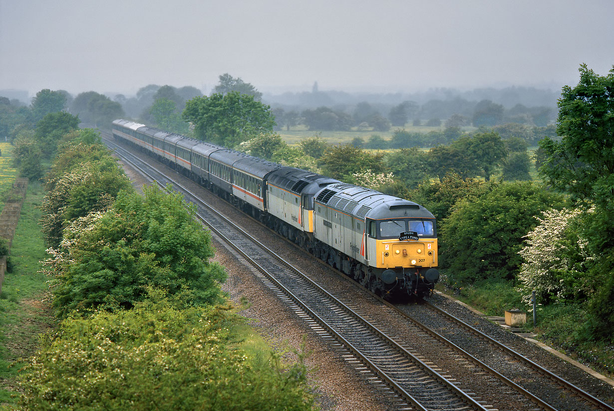 47207 Bulmers of Hereford & 47279 pass Clay Mills (Hargate) in the pouring rain on 23 May 1998 with the Resonant Charters 1Z47 05:22 Finsbury Park to Scarborough 'York & Scarborough Liner' railtour. 47207 & 47279 worked the train as far as Doncaster, from where 47361 took over for the final section to the east coast resort. |