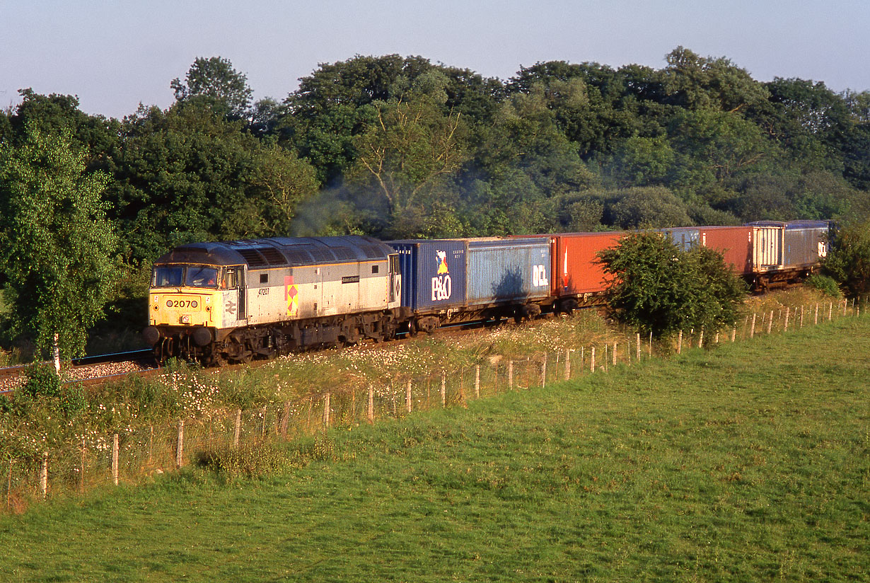 Viewed through a gap in the lineside bushes, 47207 Bulmers of Hereford passes Aynho on 29 June 1993 with the 4M99 17:14 Southampton Maritime to Trafford Park freightliner. In addition to the non-standard large number in the former headcode box, the loco's bodyside number is also in a non-standard location. In most locos it was underneath the driver's window. |