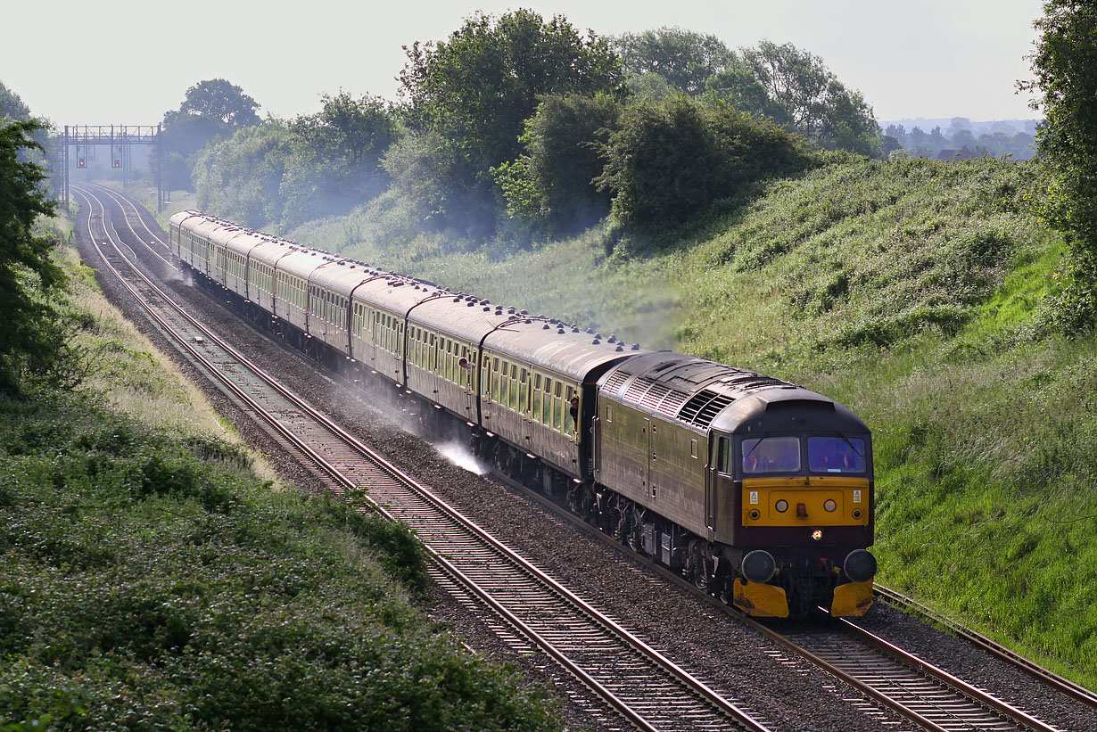 The prospect of two railtours along the Great Western Mainline within half an hour on 13 June 2009 made me venture out to my favourite local spot at Baulking. As the weather was completely cloudy when I left home I thought this would be an excellent choice of location. Typically, just because I didn't want it, the sun decided to come out, resulting in the worst possible lighting with the sun directly behind the train! So here for the record is 47245 with the Railway Touring Company 1Z27 06:45 Paddington to Kingswear 'Dartmouth Express'. BR Standard 70013 Oliver Cromwell would take over the train at Bristol Temple Meads. |