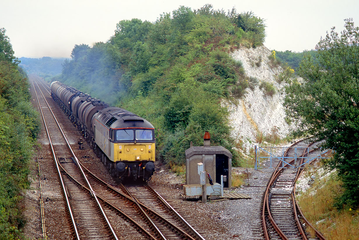 47277 passes East Grimstead on 10 September 1991 with the 6V62 10:34 Fawley to Tavistock Junction bitumen and fuel oil tanks. On the right is the disused line into a small chalk quarry, which opened in 1972. Unfortunately I never got a picture of a train using the quarry, even though it was still in use in the mid 1980s. |