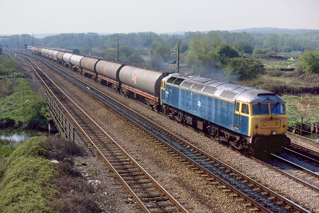Grey roof liveried 47295 passes the allotments next to Walton Well Road, Oxford, on 7 April 1990 with the diverted 6E50 09:41 Langley to Lindsey empty oil tanks. The train's normal route at the time was via the Midland Mainline.