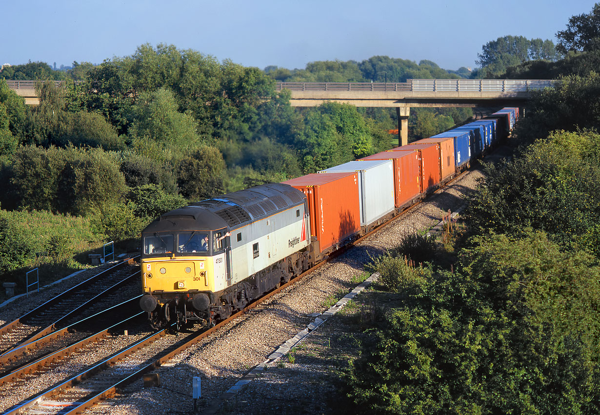With a cheery wave and a beaming smile, this driver is obviously pleased to be photographed! 47301 Freightliner Birmingham approaches Wolvercote Junction on 14 August 1997 with the 4M99 16:50 Southampton to Trafford Park freightliner. You can tell that this is late on in the evening, as not only are the shadows lengthening, but there isn't the usual nose to tail traffic on the A34 Oxford ring road in the background! |