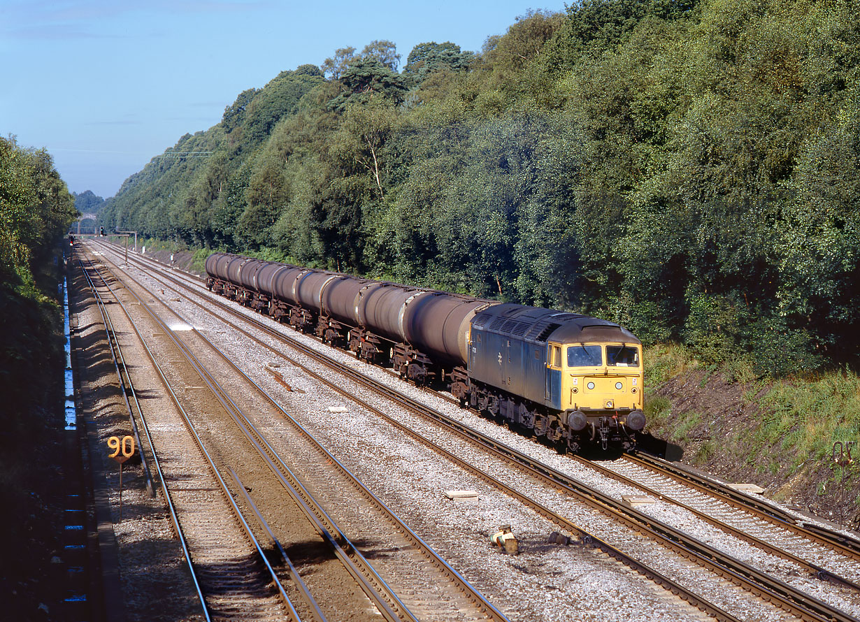 47310 passes Deepcut on 28 August 1987 with the 6Y50 09:25 Fawley to Holybourne crude oil empties. The tall bridge in the far distance is the B3015 Deepcut to Chobham Ridges road, imaginatively named Deepcut Bridge Road!