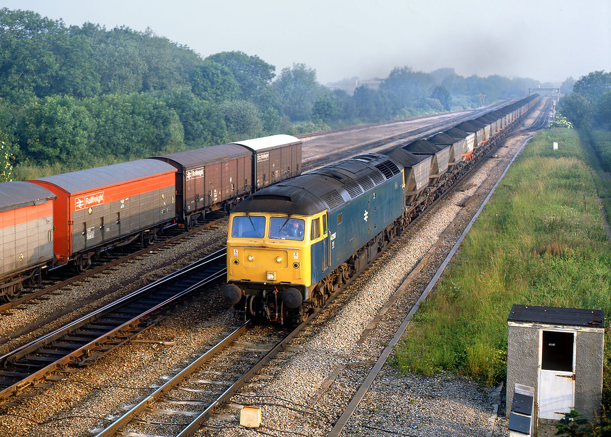 Just after dawn on 4 July 1985, 47317 passes Hinksey Yard with the 7V22 02:40 Barrow Hill to Didcot Power Station MGR. This is one of the relatively few pictures that I have of Class 47s working to Didcot, as by 1985 Class 56s and 58s predominated.