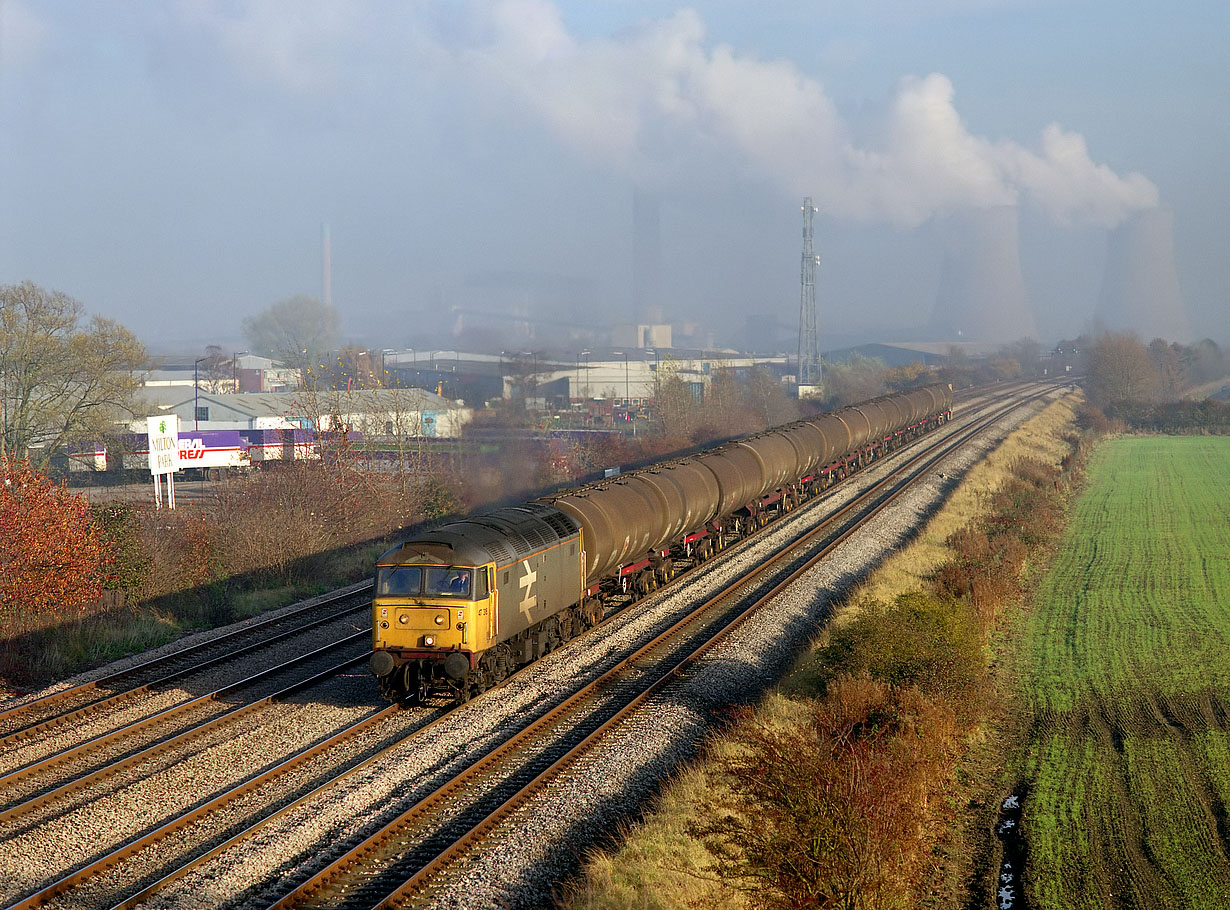 47318 passes Milton Trading Estate with the 6B27 Theale to Robeston oil empties on 16 November 1988. Although sunny at this spot, the remains of the early morning fog is still hanging around over Didcot and virtually hiding Didcot Power Station, which would normally dominate the background here. Although partially obscured by steam from the cooling towers, the station's 655 feet tall chimney (in the centre of the picture) is all but invisible. |