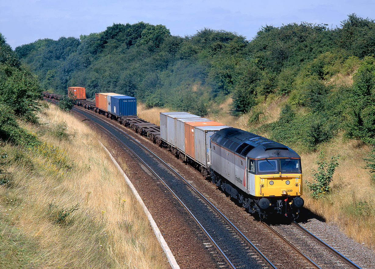 47339 passes Whitnash on 8 August 1998 with the 4O27 05:00 Coatbridge to Southampton freightliner. This loco was withdrawn the following year, and after a long period in store, was cut up by C.F. Booth of Rotherham in 2005.