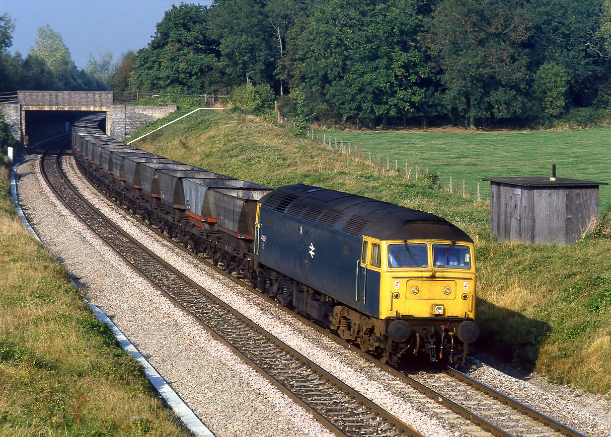 47352 passes Croome on 24 October 1985 with the 6V60 09:20 Scunthorpe to Severn Tunnel Junction MGR empties. All is now history. The plywood PW hut disappeared a long time ago, and the four wheel HAA wagons have also now vanished from the mainline. 47352 was withdrawn in 1993, and was eventually cut up at Frodingham in May 2000. |