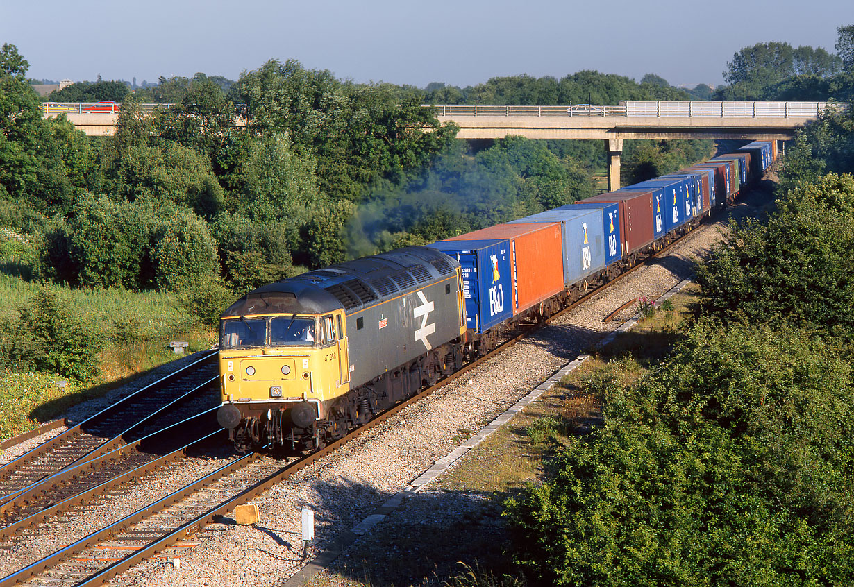 47358 Ivanhoe approaches Wolvercote Junction on 27 June 1995 with the 4M99 15:58 Southampton to Trafford Park freightliner. At this time it was one of the few Class 47s still to retain the original railfreight livery, and it certainly looks to be in need of a repaint. The unofficial name Ivanhoe had been applied at Tinsley the previous year, but was relatively short lived, having been removed from the still unrepainted loco by 1996. |