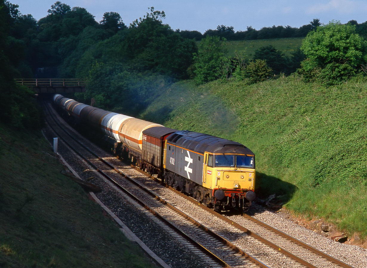 Just dodging the encroaching shadows on 30 May 1989 at Wickwar Tunnel is 47362, heading into the light with the 6V47 07:22 Haverton Hill to Severnside anhydrous ammonia. A distinctive train, which was virtually always worked by a Thornaby Class 47/3 in the 1980s. The Thornaby kingfisher logo can just be seen above the bodyside number. |