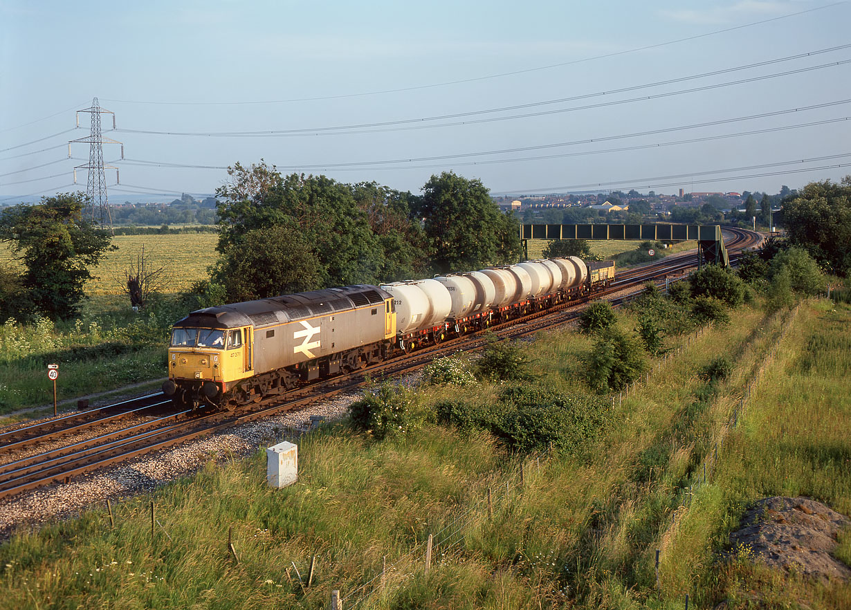 Virtually everything in this view has now changed beyond recognition. On 4 July 1991, during the final week of Speedlink wagonload freight operations, 47371 passes Didcot North Junction with the 6E30 17:18 Eastleigh to Haverton Hill Speedlink. In addition to the demise of this traditional mixed freight traffic, 47371 was later converted into a Class 57, as 57313 Thunderbirds Tracy Island, whilst the rural nature of this viewpoint has been replaced by an industrial estate on the right, and houses in the field behind the train. |