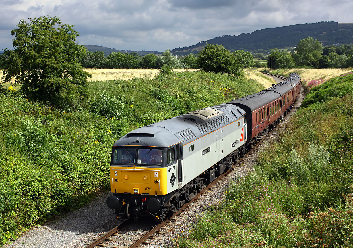 47376 Freightliner 1995 passes Southam on 28 July 2013 with the 2C55 10:00 Toddington to Cheltenham Racecourse service, during the Gloucestershire Warwickshire Railway's Diesel Gala. The dark clouds over the Cotswold Hills in the background gives some idea of the odds of getting this picture in the sun! |