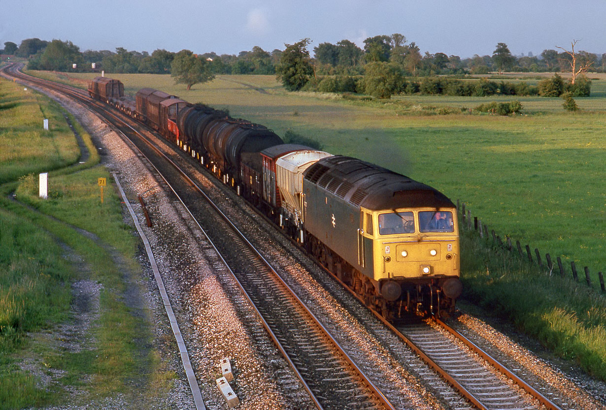With the very last rays of the setting sun just providing a little illumination, 47377 passes the site of Ashbury Crossing, near Shrivenham on 9 June 1987 with the 6V45 17:53 Willesden Brent to Severn Tunnel Junction Speedlink. Freight workings in Wales and the Gloucester area would be completely recast a few months after this picture was taken, with the closure of Severn Tunnel Junction Yard. The poor technical quality of this picture is due to the use of Kodachrome 200, to deal with the failing light. However, it is included as strangely (or perhaps not so given the time at which it ran) it is one of the few pictures I have of 6V45, and also for the variety of wagons in the consist. |