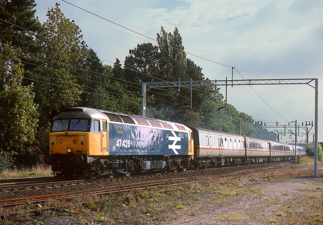 47426 passes Berkswell on 28 September 1986 with the 1M34 06:50 Brighton to Manchester Piccadilly service, which it would work as far as Birmingham New Street. Berkswell station is actually in the village of Balsall Common. Berkswell is nearly a mile away, to the north. |
