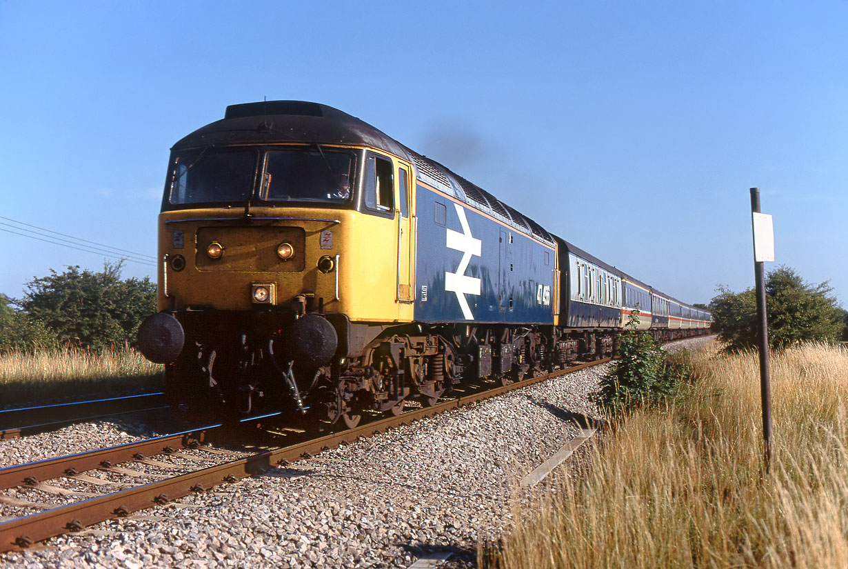 Viewed from the long since closed public footpath crossing at Hampton Gay, 47456 speeds northwards on 11 July 1989 with the 1M23 15:10 Poole to Manchester Piccadilly InterCity service. This was definitely the era of large logo 47s on passenger workings, as just ten minutes later 47638 appeared from the opposite direction. |