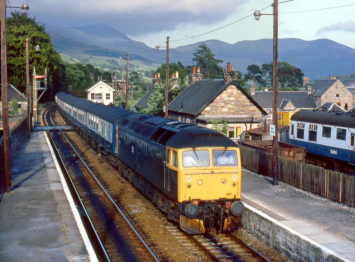 47460 arrives at Blair Atholl on 14 July 1983 with the late running 1N36 17:35 Glasgow Queen Street to Inverness service. Apart from the sleeper service, this was the last northbound passenger service of the day over the Highland Main Line. Note the Mk 1 buffet car parked in the siding. |