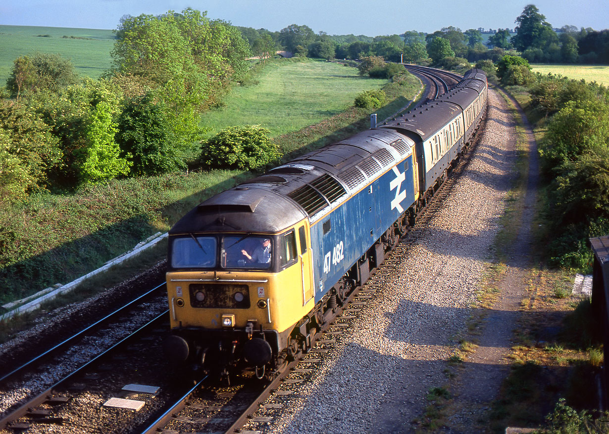 47482 sweeps round the curve on the approach to Heyford on 24 May 1990 with the 1M85 14:32 Tonbridge to Preston parcels. This viewpoint no longer exists, as tall trees now border the line on both sides, no doubt contributing to rail adhesion problems in the autumn. |
