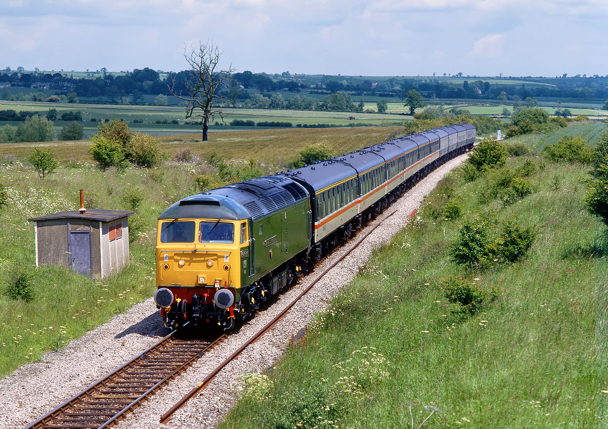 47484 Isambard Kingdom Brunel passes Chilson on 16 June 1985 with the BR sponsored Marylebone to Worcester Shrub Hill 'Sunday Lunch Pullman' railtour. This had been steam hauled to Banbury, and then travelled to Worcester via the Cotswold Line, after a reversal at Oxford. Unfortunately I wasn't so lucky with the light when the train returned later in the day. |