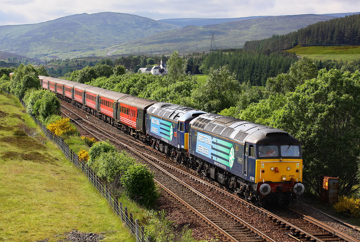 47501 Craftsman & 47805 John Scott 12.5.45 - 22.5.12 pass Dalnacardoch on 26 June 2013 with the Compass Tours 1Z43 16:01 Aviemore to York 'Highland Clansman' railtour. Plenty of colour contrast here, with both the DRS blue locos and the ex Virgin red coaches standing out well from the green landscape. At 17:00 the sun was finally breaking through the cloud, and of course would be out virtually all of the time as I commenced the long drive home! |