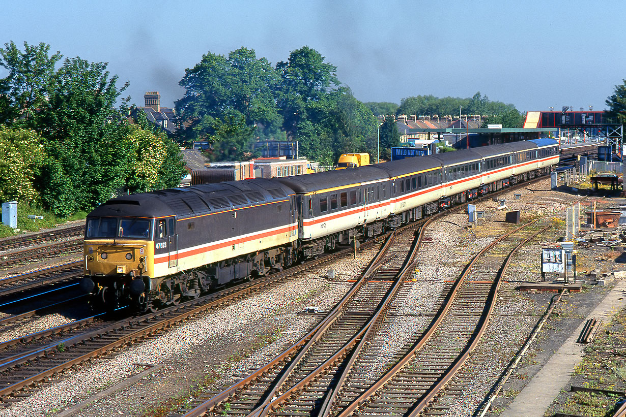 47523 leaves Oxford station on 26 May 1990 with the 1O04 06:45 Wolverhampton to Poole service. After several years of mixed liveried trains in the Oxford area, things had largely settled down by 1990, with complete InterCity rakes, as here, and complete Network SouthEast rakes on the Paddington trains. |