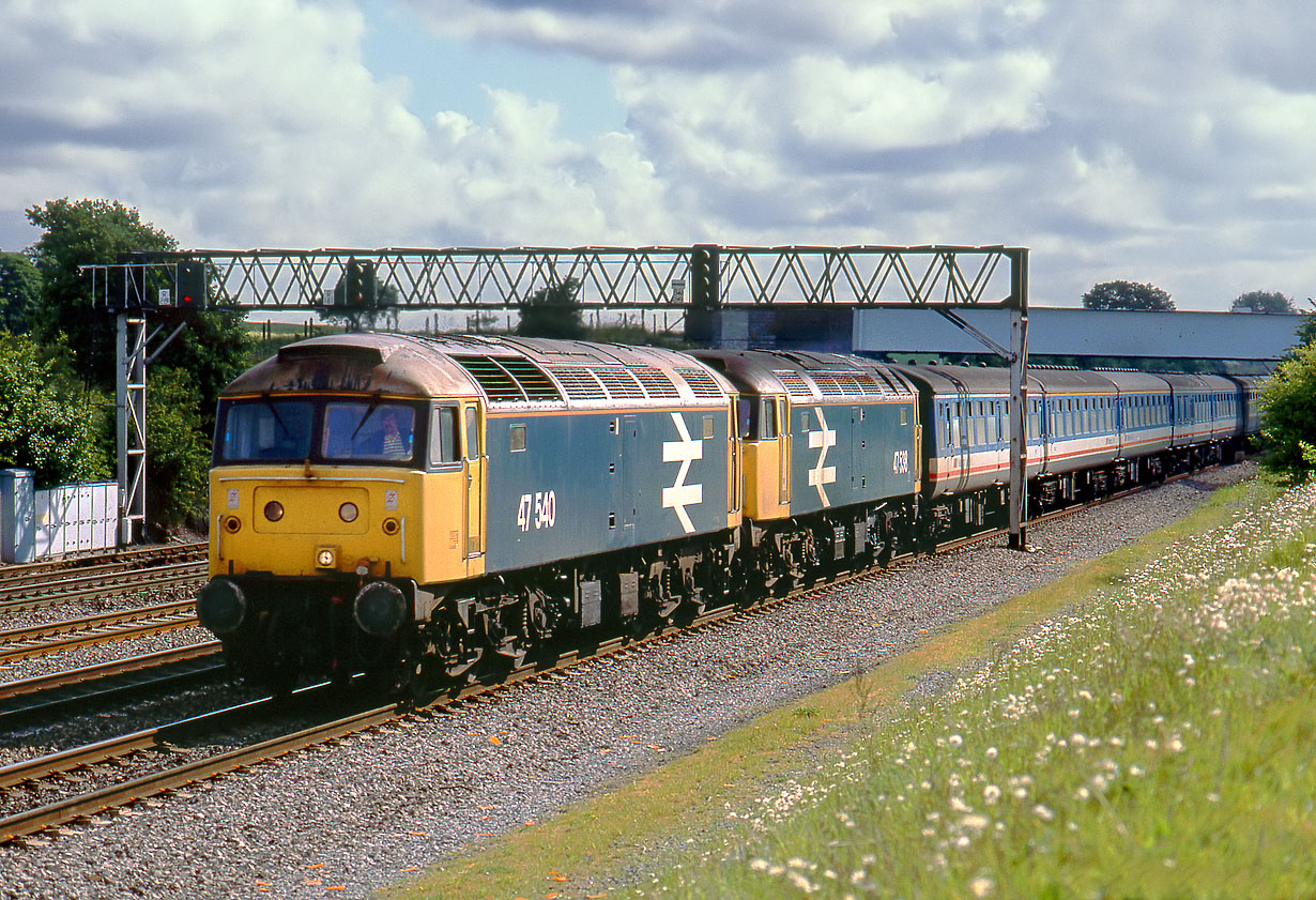 Although by no means rare, a pair of Class 47s on the Paddington to Oxford Network SouthEast trains in the late 1980s was always worth photographing. On 2 June 1989, 47540 & 47538 speed past Waltham St Lawrence with the 08:15 Paddington to Oxford service. As this was the start of the period that saw a multitude of liveried locomotives on these trains (rail blue, large logo, InterCity, NSE, and even ScotRail!), it was a bit of luck to get a matched pair of large logo machines. |