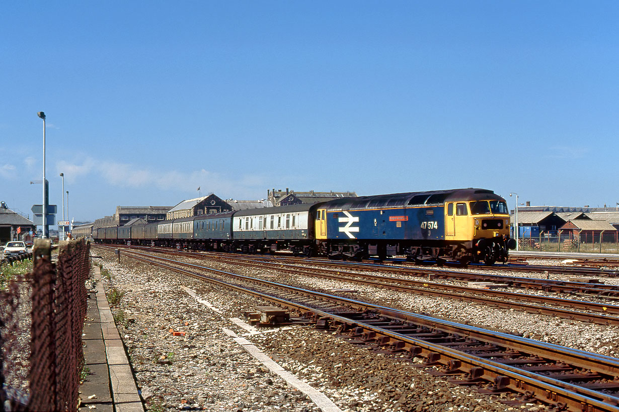 47574 Benjamin Gimbert G.C. arrives at Swindon on 15 July 1989 with the 3A12 06:45 Swansea to Old Oak Common newspaper empties. This was booked to stop at Swindon for 20 minutes, although it may have been even longer on this occasion, as it was running early. |