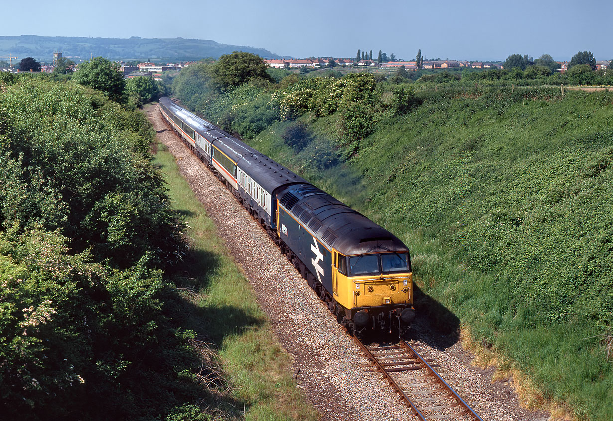 Sundays in the late 1980s brought an increase in loco-hauled activity to the Cotswold Line as inter-regional trains were diverted off the Oxford to Birmingham route. Rather than being an ad-hoc arrangement, this ran throughout the entire currency of the timetable. 47591 passes Aldington on 28 May 1989 with the 07:10 Manchester Piccadilly to Poole service. |