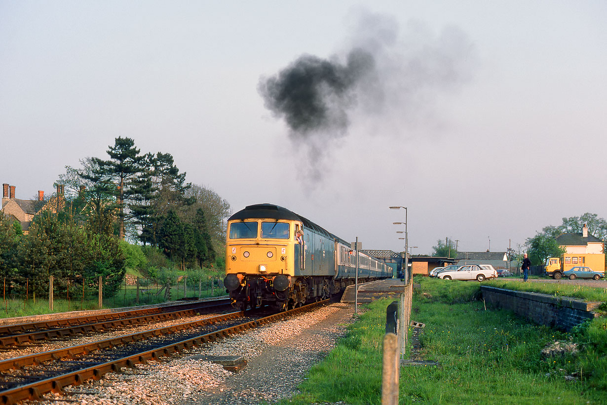47606 Odin makes a characteristic smoky Sulzer departure from Kingham station on 17 May 1985 with the 1B56 18:07 Paddington to Hereford 'Cathedrals Express'. Although unfortunately the impressive Great Western Railway brick built station building had been demolished in the early 1970s, Kingham station still retained some period features in the 1980s. Both lines are still 95lb per yard bullhead track, and the loading dock on the right has yet to be swallowed up by the later car park extension. In fact, in 1985 the passenger traffic was still so low that the small car park was hardly ever full. |