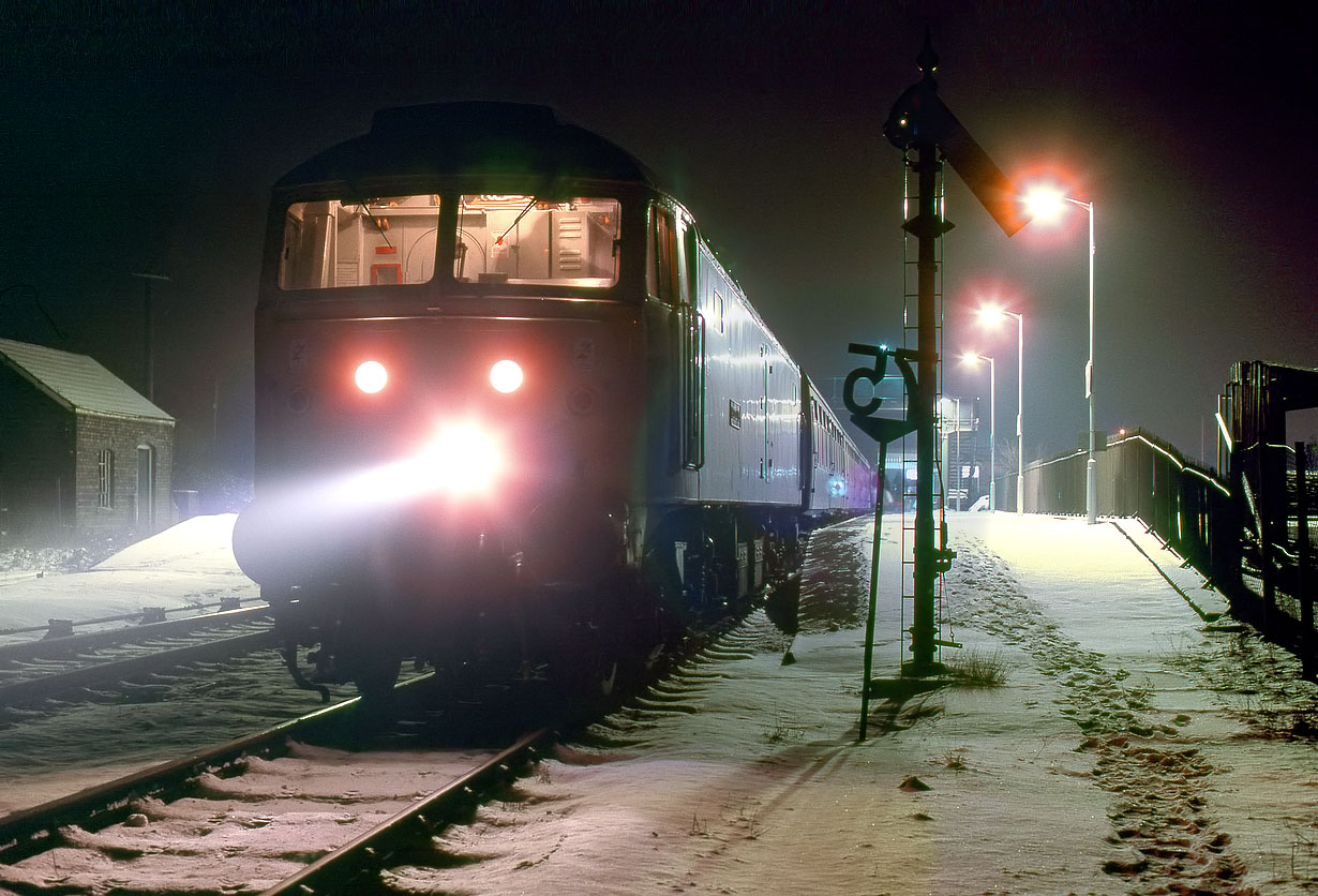 The signal is off, and the 'ghost' driver of 47624 Cyclops is ready to leave Moreton-in-Marsh on 16 January 1985 with the 1B56 18:07 Paddington to Hereford service, which on this occasion was running 15 minutes late. Punctuality on the Cotswold Line was much better in the 1980s compared with today, but I suppose considering the weather conditions, 15 minutes late isn't too bad! |