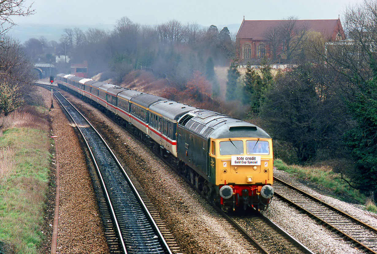 Having dropped off the racegoers, 47628 Sir Daniel Gooch accelerates away from Cheltenham on 17 March 1988 with the ECS from the Tote Credit 1Z10 10:30 Paddington to Cheltenham 'Gold Cup Special'. Note that they have taken the trouble to place the headboard on the front of the empty train. The chapel of Dean Close School dominates the background. |