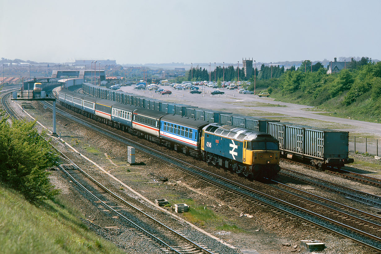 47645 Robert F. Fairlie Locomotive Engineer 1831-1885 pulls away from Bristol Parkway station on 6 May 1989 with the 1M56 11:55 Plymouth to Manchester Piccadilly InterCity service. It is passing the stabled Avon 'Binliner' rubbish train. Bristol Parkway station was opened in 1971, and was the pioneer of the new large out of town 'park and ride' stations. Apologies for the poor quality if this image, but it has been salvaged from an Agfachrome 100RS 6x7 transparency, which in the best traditions of Agfa slide films has now gone completely purple, with hardly a hint of any other colour! Their claims in the 1980s that this well known problem had been cured led me to try a few rolls. A couple of decades have proved that they were wrong! |