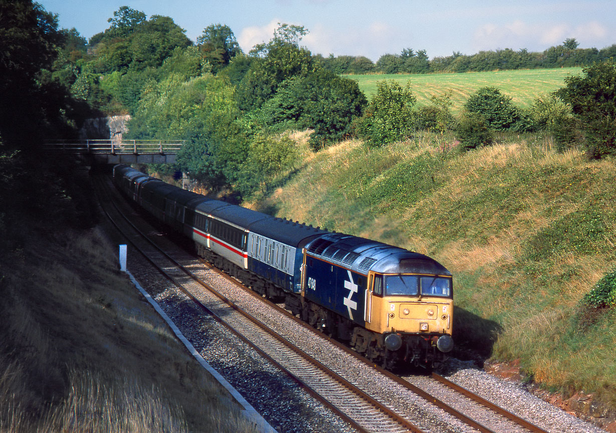 47648 emerges from Wickwar Tunnel on 3 September 1987 with the 1V73 10:50 Glasgow Central to Plymouth service, which it had taken over at Birmingham New Street. I should have arrived here earlier in the day, before the shadows were so prominent!