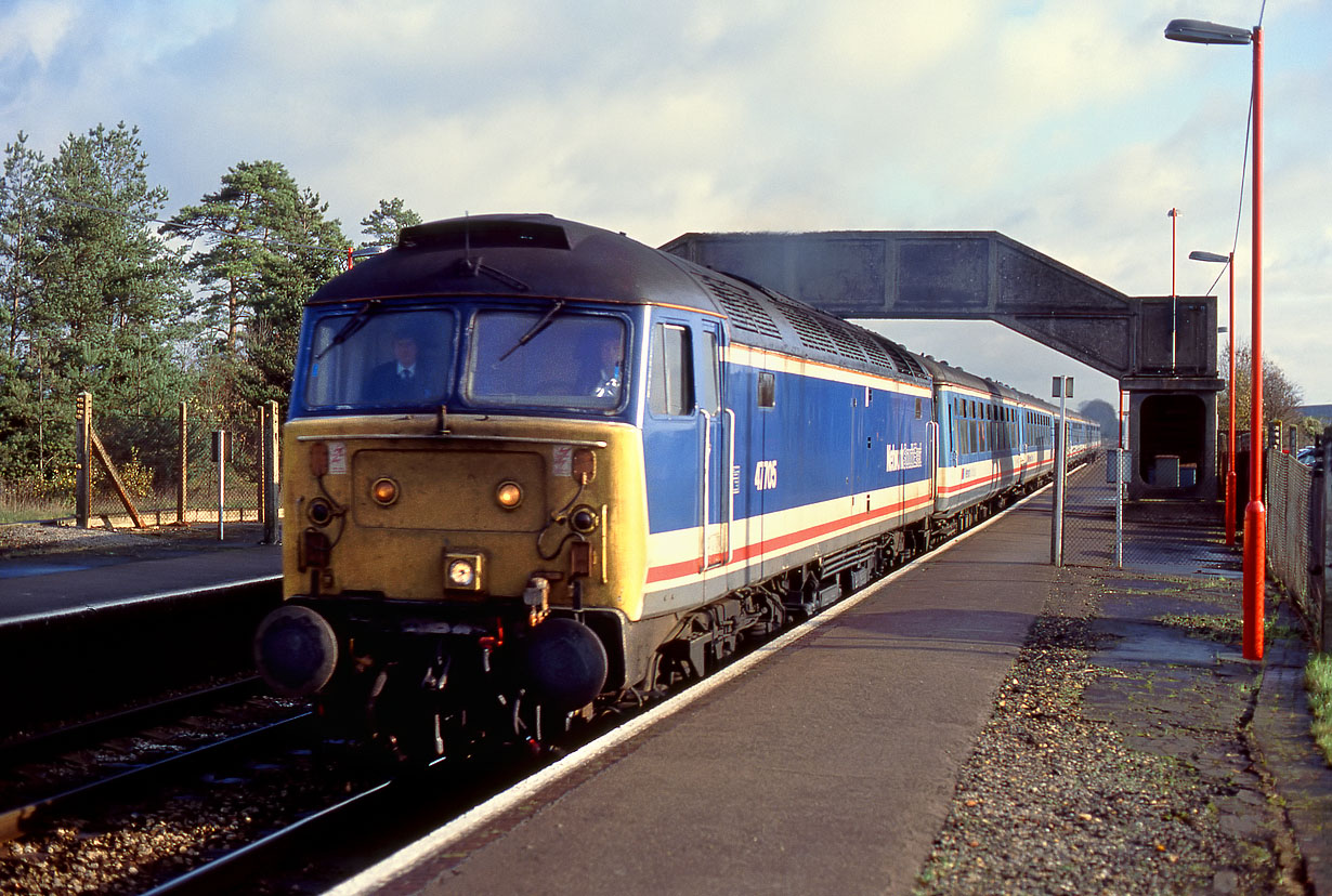 47705 arrives at Grateley station on 14 November 1991 with the 1V09 08:40 Waterloo to Exeter St Davids Network SouthEast service. I remember noting that the train was virtually empty, but presumably there isn't much demand for an early morning train from London to Devon in late autumn! |