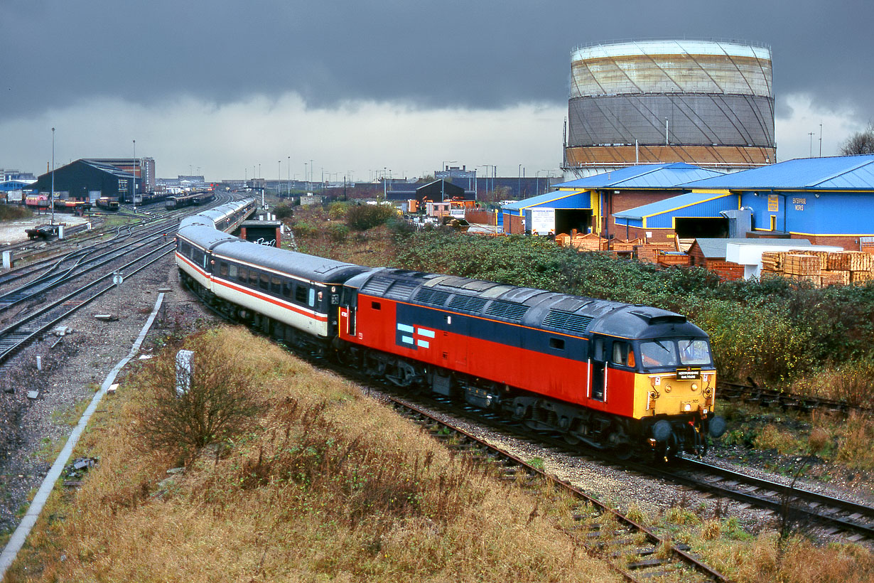 47705 passes Highworth Junction on 3 December 1994 with the Hertfordshire Railtours 1Z60 07:50 Paddington to Bristol Temple Meads 'Westerleigh Wizard' railtour. The train would only travel a short distance further, as only a short section of the former Highworth branch now remains. 37072 & 37264 would then bring the tour back out on the mainline. As can be seen from the dark clouds in the background over Swindon, it was not a very pleasant day, and prior to the train turning up we had got well and truly soaked! |