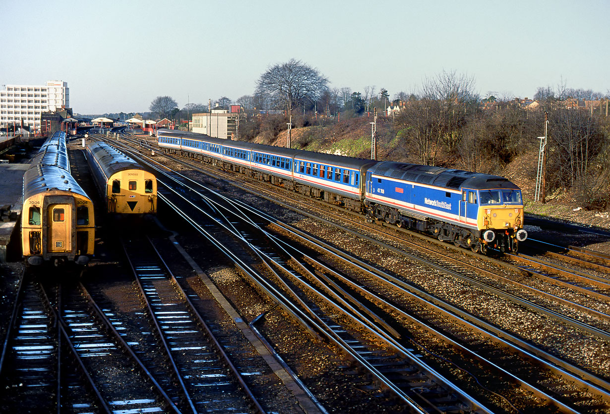 The first up train of the day on the West of England line leaves Basingstoke on a bright but cold Sunday 16 February 1992. 47708 Templecombe is working the 2L18 08:28 Salisbury to Waterloo Network SouthEast service. This picture encapsulates the full range of old style motive power in the area, including loco hauled, slam door EMUs, and DEMUs. On the left Class 423 4-VEP EMU 3006, and Class 205 DEMU 205033 are awaiting their next turn of duty. |