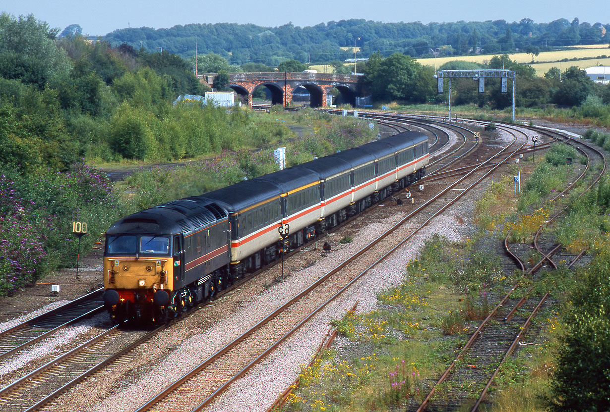 47709 Dionysos approaches Wellingborough on 19 July 2002 with the 1B19 09:28 Nottingham to St. Pancras service. This was a regular working at the time, with the loco and stock being hired in to cover for a lack of Midland Mainline HSTs.