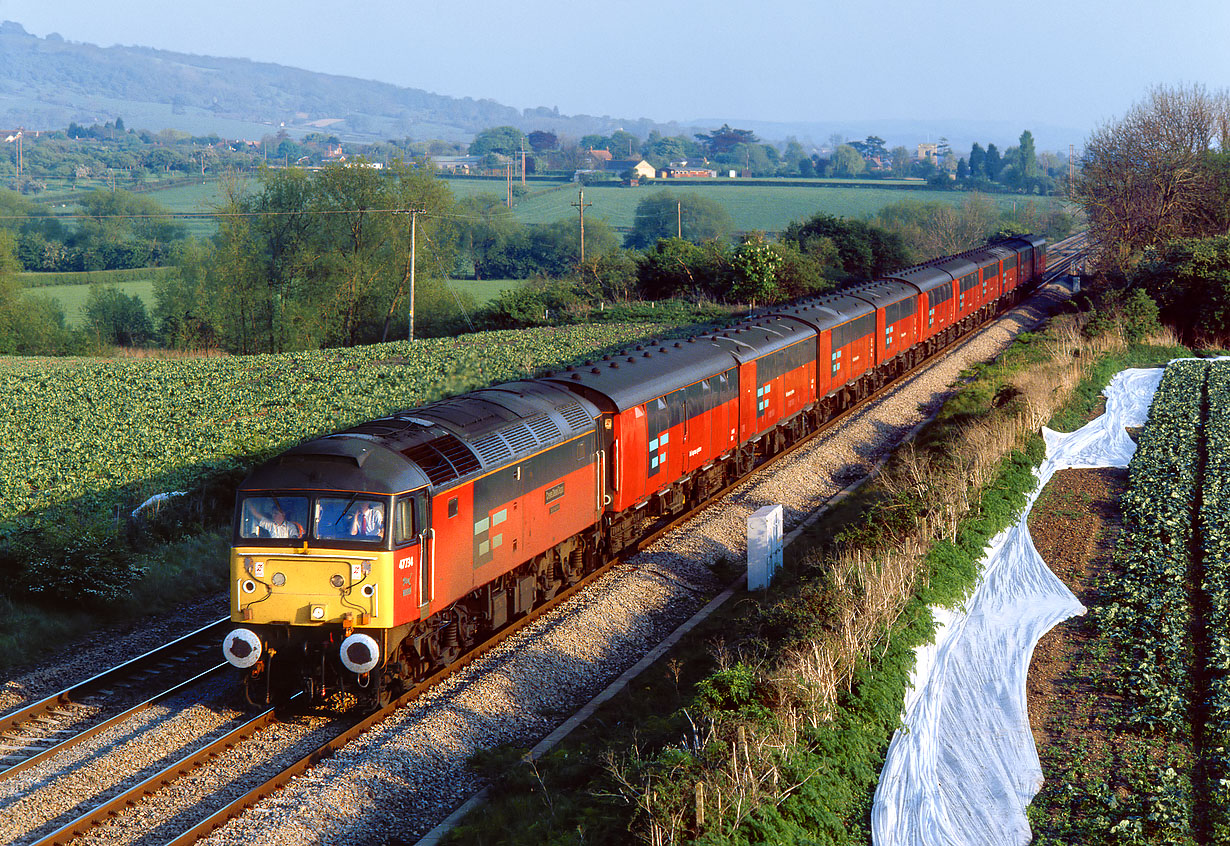 47734 Crewe Diesel Depot Quality Approved passes Defford in superb evening light on 1 May 1997 with the 1E43 15:09 Plymouth to Low Fell mail vans. This train was booked for ten vans, whereas the earlier running 1S81 12:44 Plymouth to Glasgow was only booked for seven. |