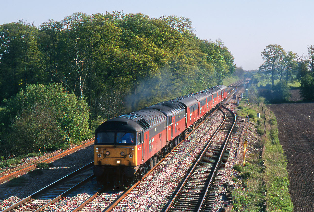 47745 Royal London Society for the Blind & 47762 pass Spetchley on 30 April 1999 with the 1S81 12:44 Plymouth to Shieldmuir Royal Mail vans. I'm not sure why there was a pair of locos on this, but it was certainly a welcome surprise.