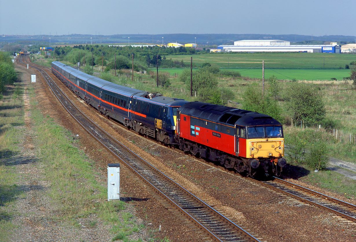 47749 Atlantic College drags the diverted 1A15 16:14 Leeds to Kings Cross GNER service past Normanton on 30 April 2000, with the train's normal means of propulsion, 91030, directly behind the Class 47. The Bank Holiday closure of the line between Leeds and Wakefield for engineering works was the reason for the deviation. |