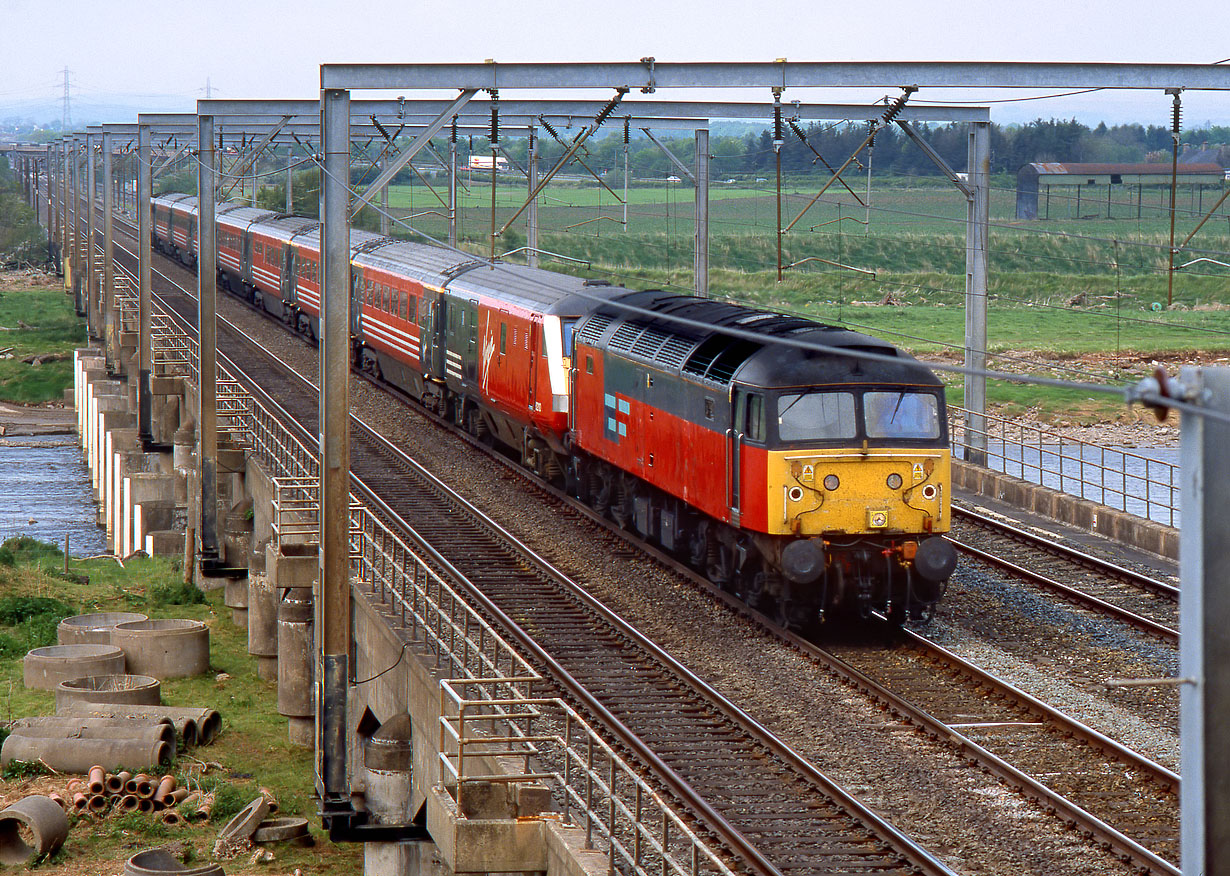 When the 1M22 09:36 Glasgow Central to Euston Virgin West Coast service failed between Beattock and Lockerbie on 17 May 2002, 47782 was sent to assist. The train is pictured crossing the River Esk at Metal Bridge, running a staggering 155 minutes late. DVT 82110 is directly behind the locomotive. |