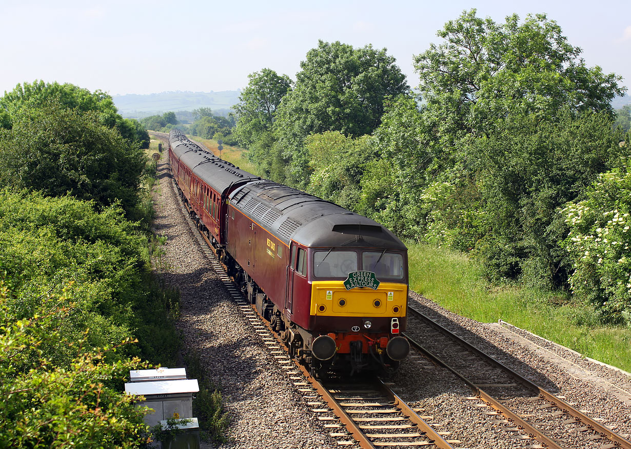 47804 brings up the rear of the Kirklees Green Party 1Z13 06:15 Sheffield to Salisbury 'Mid Summer Salisbury Spire' railtour at Bishop's Itchington on 23 June 2009. 47826, complete with its unusual Scarborough Spa Express branding, was leading.