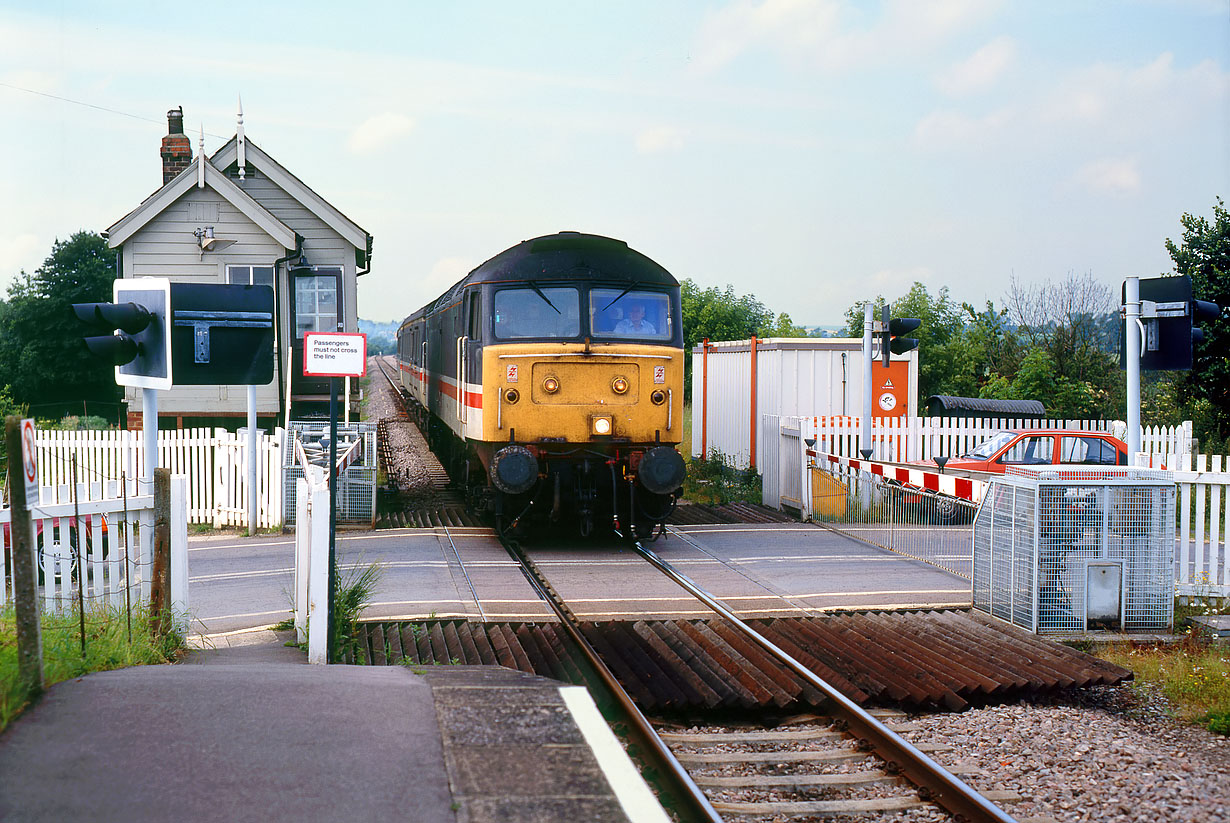 47828 passes Ascott-under-Wychwood signal box on 7 July 1991 with the 1O06 08:30 Wolverhampton to Poole service. It looks like the train is composed of just a couple of coaches, but the rest of the train is hidden, as it is just coming off the double track section of the Cotswold Line. I think the signalman must have had to get out of the passenger side of his car, as it is parked extremely close to the fence! |