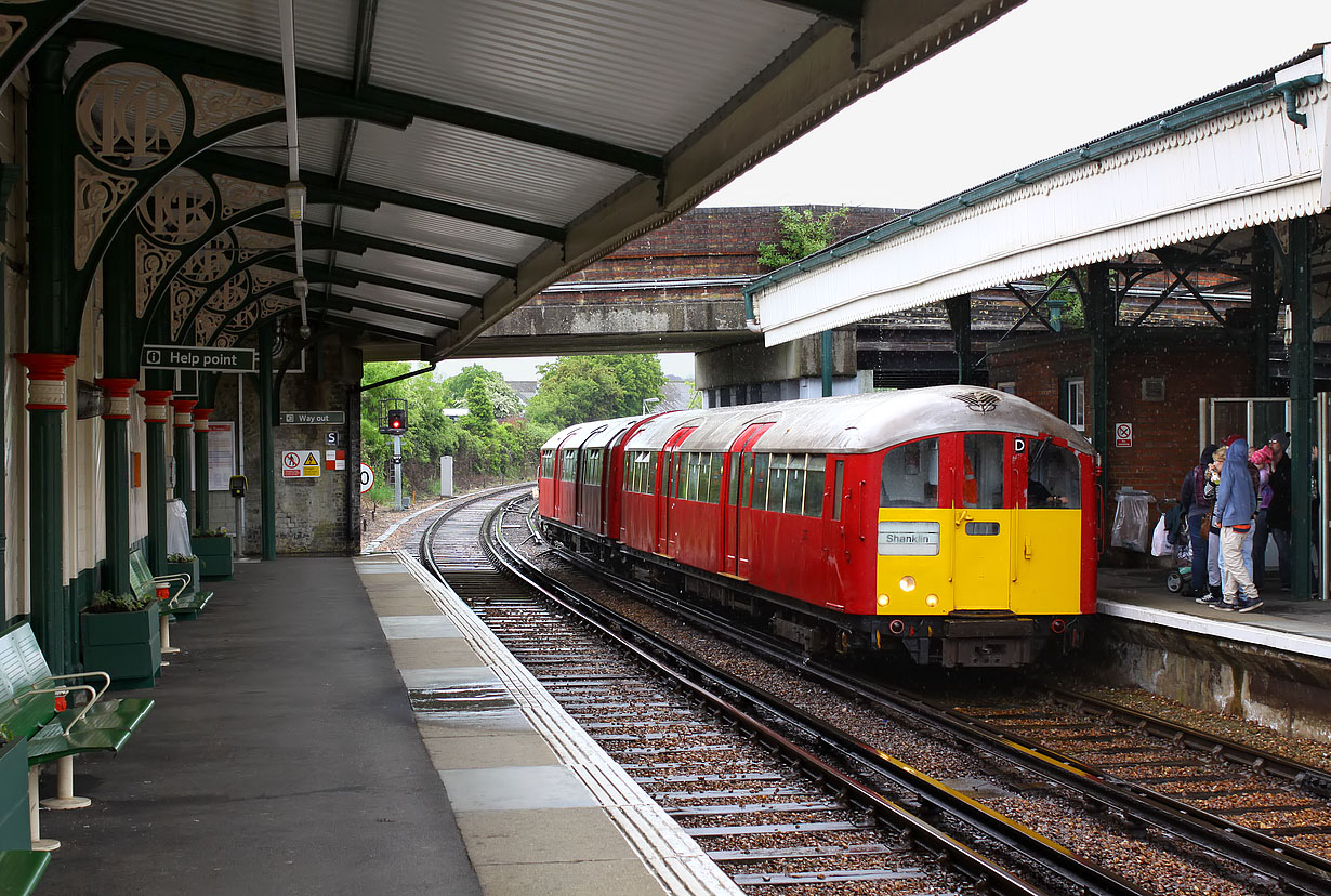 With the rain cascading off the station canopies, 483007 arrives at Ryde St John's Road on 28 May 2013 with the 2D37 14:49 Ryde Pier Head to Shanklin service. Note the Isle of Wight Railway Company cast iron platform awning brackets. Always looking on the bright side (so to speak!), I decided to make the most of the terrible weather conditions by taking the picture from underneath the canopy, which would normally be in dense shade if the sun was out. Keeping dry was of course another consideration! |