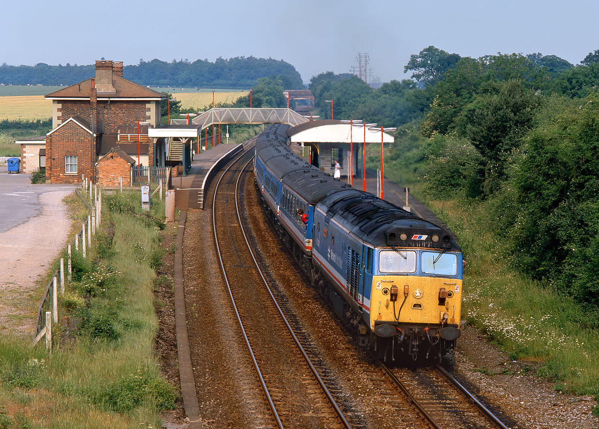 50001 Dreadnought pulls away from Whitchurch station on 17 June 1989 with the 1O16 06:45 Exeter to Waterloo Network SouthEast service. This is one of the few pictures that I took on this line before 1991. With the imminent demise of the 50s, 1991 turned into a mad panic year, with virtually every spare day spent photographing them on the route to make up for lost time! |