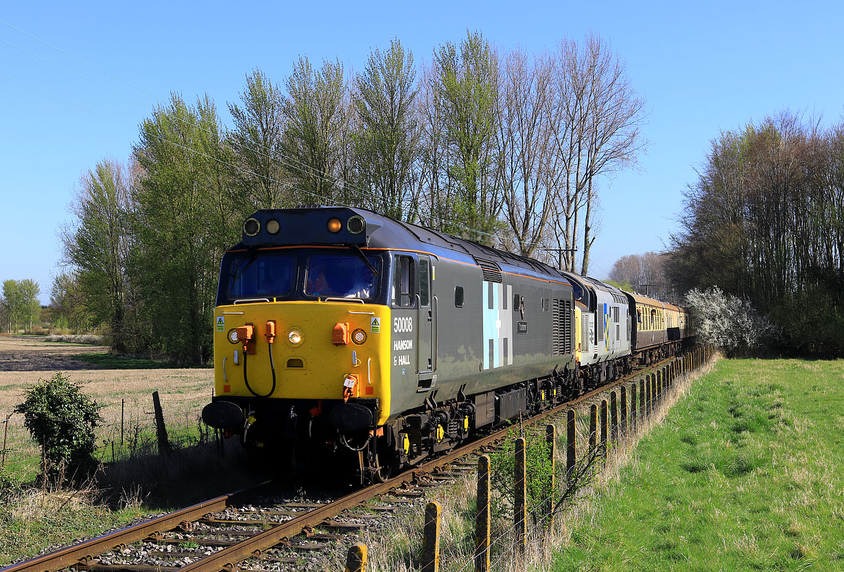 50008 Thunderer & 37227 pass Wainhill on 6 April 2025 with the 10:25 Princes Risborough to Chinnor service, during the Chinnor & Princes Risborough Railway's Diesel Gala. Despite the line's speed restrictions, the 38 cylinders of English Electric power could heard for some distance! |